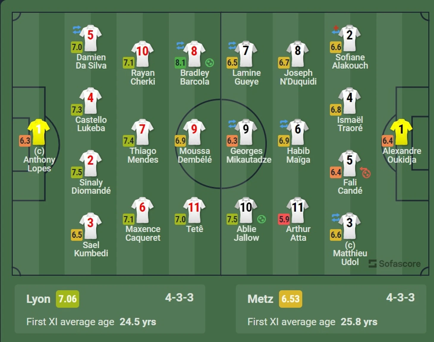 В целом первый тайм - доминация Лиона, тотальное владение, попытки забить, которые не увенчались успехом и мертвый Мец, который не совершил не одного удара, хотя пытались проходить через проблемный правый флаг и Самуэль Кумбеди, один из худших в этом тайме, мог привезти (всё равно с натяжкой, если бы Мец был чуть агрессивнее), благо ему очень сильно помогал пахарь Диоманде, которому стоит поаплодировать стоя.