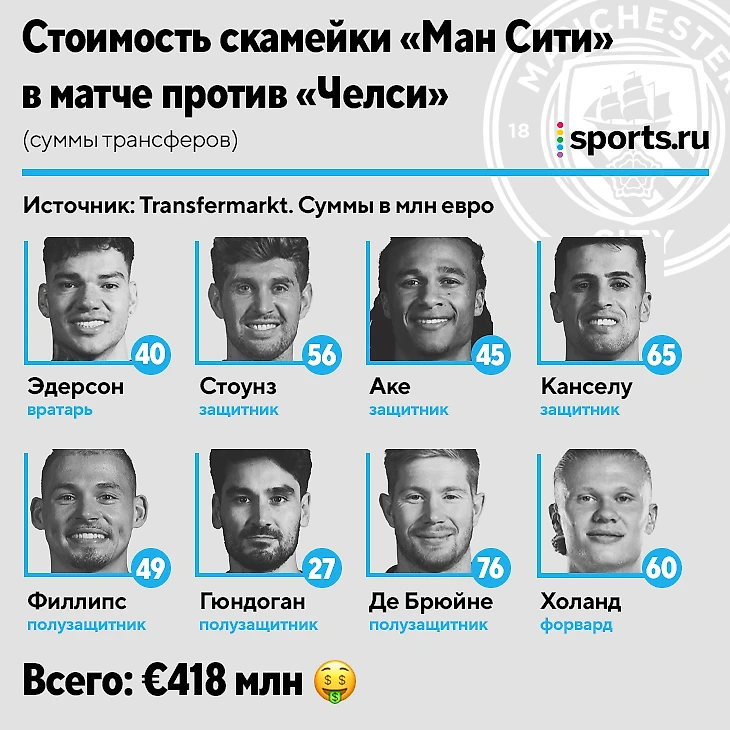 • Самый дешевый игрок на лавке (из тех, кого покупали) − Илкай Гюндоган. В старте вышли сразу 5 игроков, за которых платили меньше: Альварес (21 млн), Гомес (13 млн), свободный агент Ортега и воспитанники Фоден и Палмер.