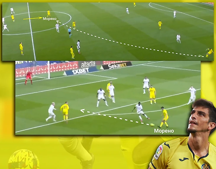 Примером хорошего позиционирования послужит нападающий Жерар Морено. В ситуации открытого мяча он находится в той же точке (между Милитао и Рюдигером), но с иным расположением корпуса. Он стоит полубоком и готов сделать рывок в штрафную и нанести удар. К сожалению, Жерар угодил в офсайд. Положительные качества нападающего здесь не заканчиваются. На протяжении всего матча от него исходила инициатива в продвижении мяча. Морено грамотно опускался в центр, после чего двигал мяч к штрафной и разрезал атакующие построения Реала. Его попытки ускорить игру были не всегда удачными, но часто напрягали Мадридцев.