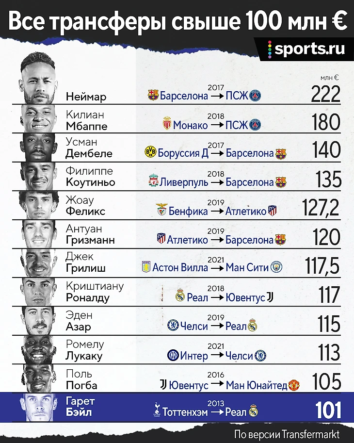 Тем летом Гарету исполнялось 24 – как и Роналду на момент перехода в «Реал». И он стал первым игроком, за которого заплатили больше 100 млн евро. Помимо Роналду (94 млн) и приехавшего тем же летом, что и Бэйл, Неймара (88 млн), вслед за валлийцем расположились только олдскульные легенды: Зидан (77,5 млн), Ибрагимович (69,5 млн), Кака (67 млн) и Фигу (60 млн).