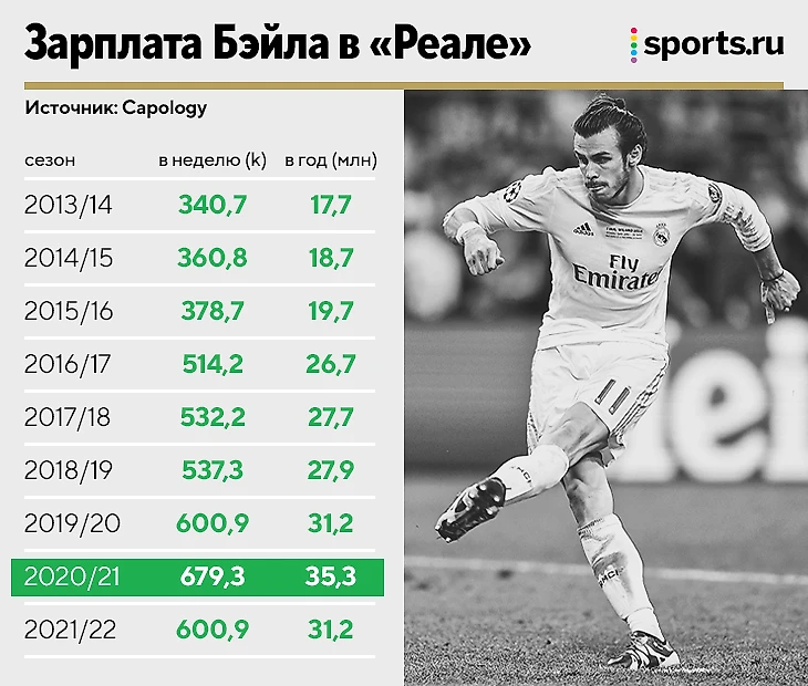 • Пиковый доход Бэйла – в сезоне-2020/21 (из-за переносов задолженности за ковидный отрезок), когда он ушел в аренду в «Тоттенхэм». Клуб покрыл часть зарплаты (примерно 250 тысяч евро), остальное платил «Реал».