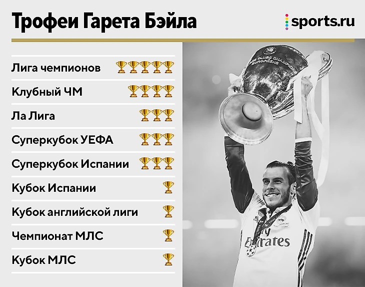 Со сборной Бэйл трофеев не брал (хотя и дотащил Уэльс до бронзы Евро-2016), зато с запасом насобирал чашек в клубах. Большинство, конечно, в «Реале».
