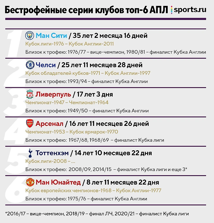 •‎ Только «Юнайтед» из классической Big Six закрывал серии быстрее − у остальных периоды без трофеев длились дольше нынешнего «Тоттенхэма».