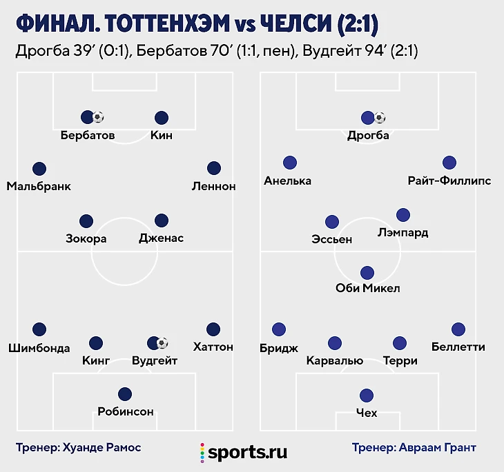 Это было так давно, что из состава «Тоттенхэма» на тот финал закончили вообще все. У «Челси» до сих пор играет только Саломон Калу: летом подписал контракт с действующим чемпионом Джибути − клубом «Арта/Солар7».