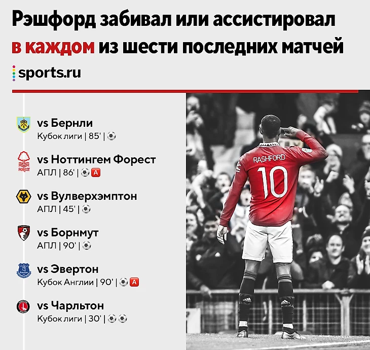 После трех голов на ЧМ-2022 Маркус Рэшфорд разогнался и в клубе: во всех 6 матчах после возобновления сезона он обязательно забивал (а иногда еще и добавлял к голам ассисты).