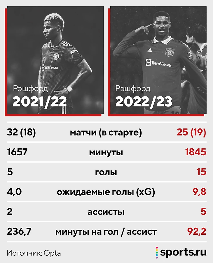 Статистика Рэшфорда действительно радует – особенно на фоне того, что было с ним в прошлом сезоне. Маркус уже забил в 3 раза больше, чем за весь сезон-2021/22, и сделал в 2,5 раза больше ассистов.