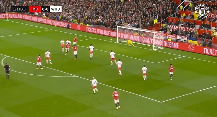 Именно так и забили «Ноттингему» первый гол: Эриксен вместо подачи с углового покатил низом, а Рэшфорд с дальней штанги примчал в центр и замкнул.