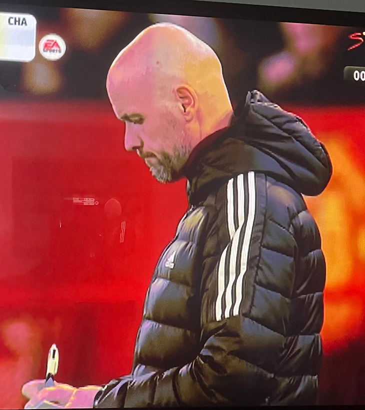 Сразу же после этого удара камеры выхватили Эрика тен Хага, который с хмурым видом что-то записал в своем блокноте.