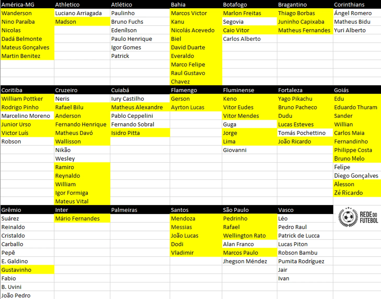 Таблица переходов в Бразилейрао, желтым выделены зарегистрированные трансферы