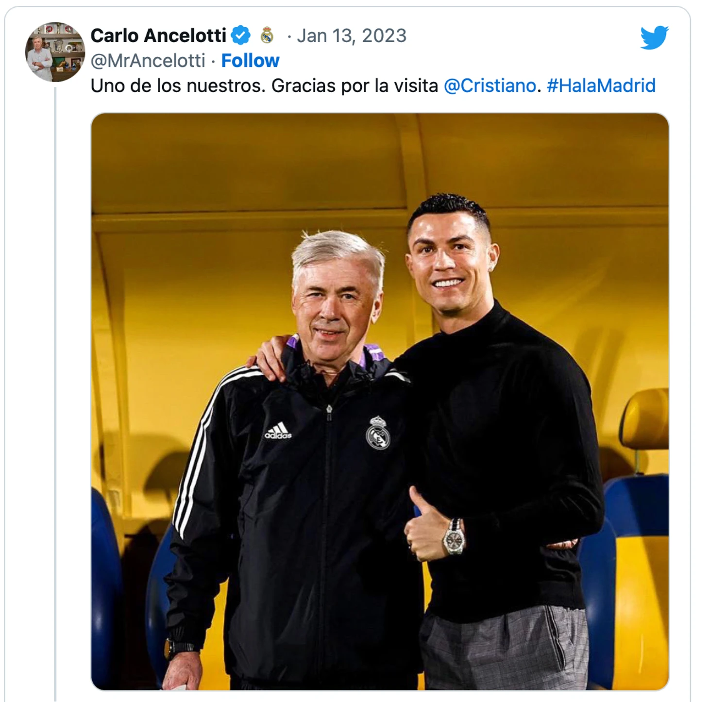 Криштиану Роналду встретился со своим бывшим тренером Карло Анчелотти во время тренировки мадридского «Реала» в Саудовской Аравии перед финалом Суперкубка Испании.