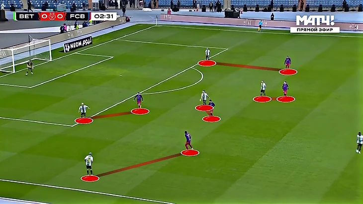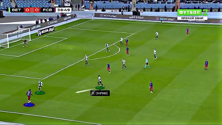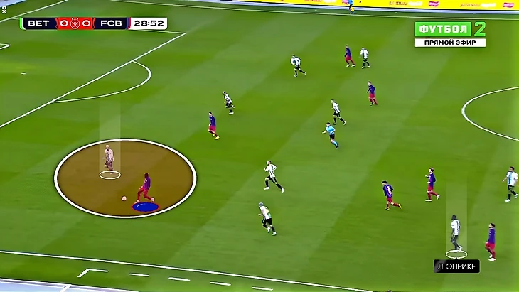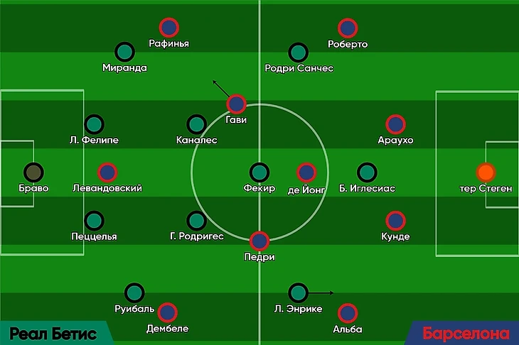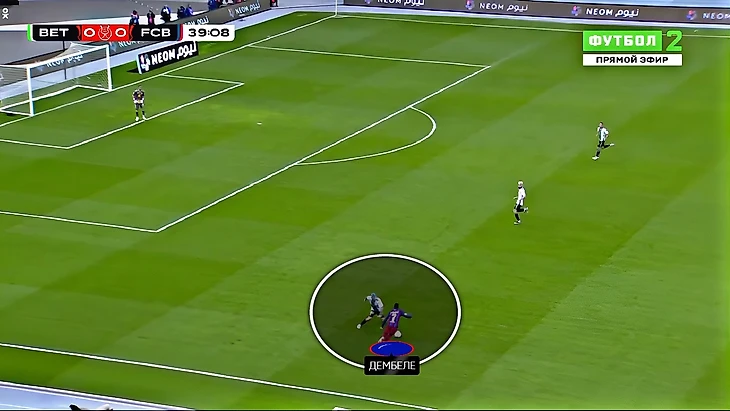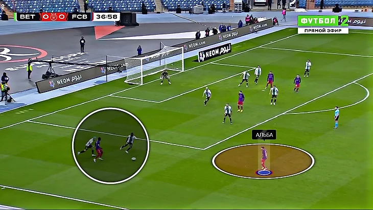 Тем не менее, Хави вернулся к ранее неудачному варианту и на сей раз он выстрелил: Рафинья просто сыграл как обычно (2 обводки, 2 передачи под удар + пас на отменённый гол), а Дембеле слева провёл выдающийся матч. Кажется, за всё время в «Барсе» Усман никогда не играл так на этой позиции. Дело не только в цифрах (к ним мы ещё вернёмся), но и условиях, в которых он выдал этот перформанс: «Бетис» стремился постоянно оставлять двух игроков против француза – к Руибалю опускался Луис Энрике: