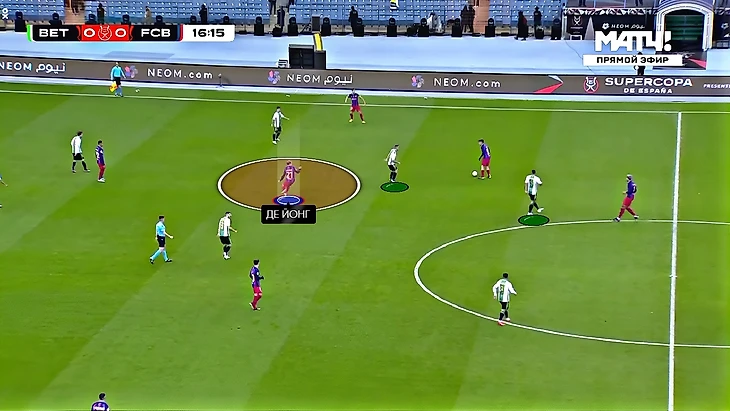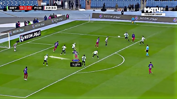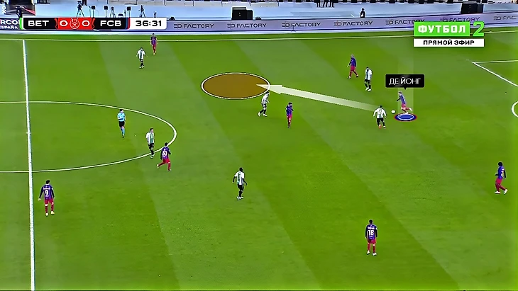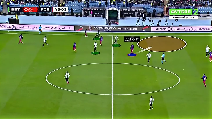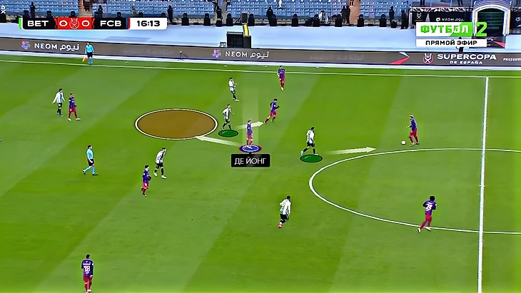 С точки зрения подвижности вообще вся тройка полузащиты «Барселоны» в этом матче выглядела очень здорово и лаконично. Абсолютно все сильны с точки зрения движения без мяча. Так, именно благодаря своевременному рывку, Педри забил гол, который был отменён только лишь из-за микроскопического офсайда у Рафиньи: