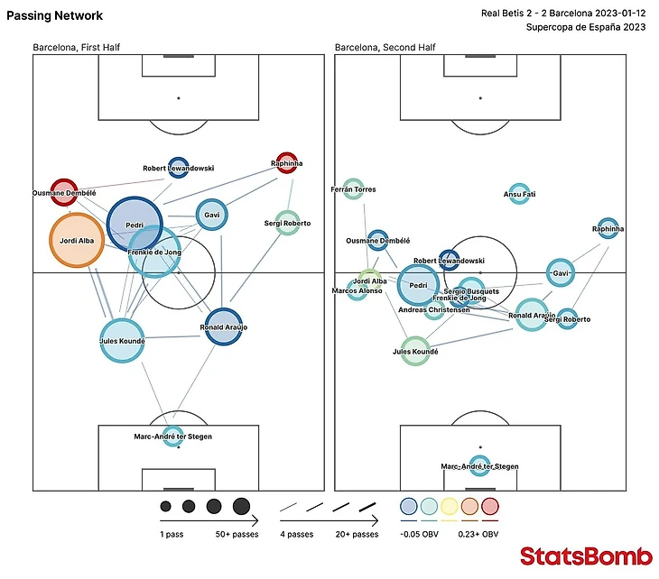 Есть разные версии, когда характер игры изменился. Многие говорят о разных таймах, но я считаю, что правильно ставить водораздел на 63-й минуте, когда Хави произвёл двойную замену – Дембеле и де Йонг покинули поле, а их места заняли Ферран и Бускетс. Француза и голландца заменили из-за дискомфорта в качестве меры предосторожности, и Хави не стоит обвинять, что он не рискнул. Проблема в том, что вышедшие футболисты не очень подходили к новым реалиям матча. До 63-й минуты «Барса» владела мячом 68% времени, но потом, до конца основного времени даже не превзошла соперника в этом компоненте (50%). Разницу хорошо отражают карты передач за первый и второй тайм (при этом нужно учитывать, что во втором тайме всё-таки были хорошие 20 минут):