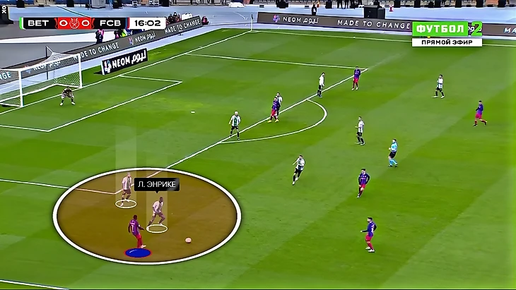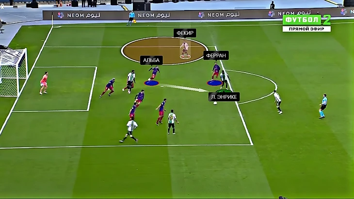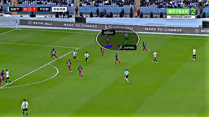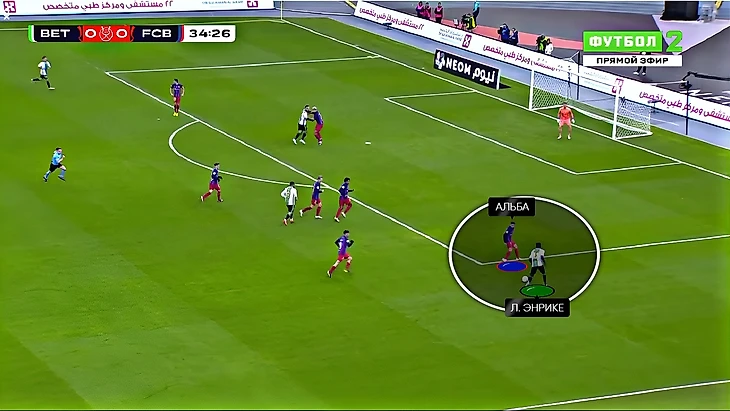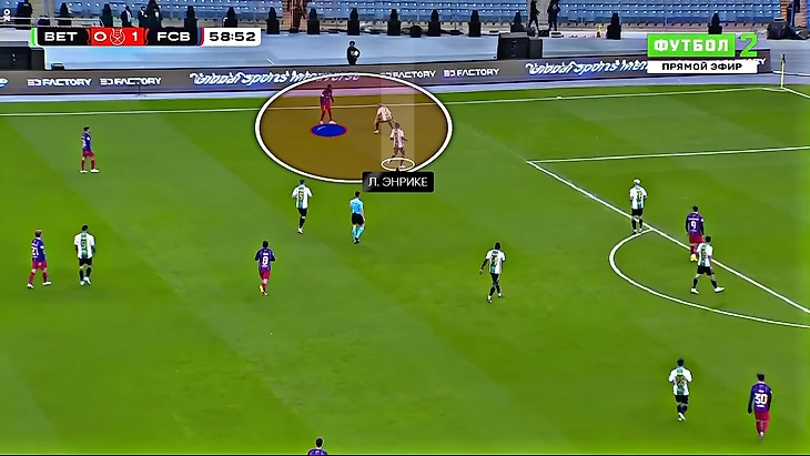 С 63-й минуты до конца основного времени у команд одинаковый процент владения, при этом «Бетис» нанёс 7 ударов (4 из штрафной) против всего двух у «блауграны». Если мы рассмотрим отрезок с замен «Барсы» до гола Фекира, то владение мячом у «бетикос» вообще составляет 61%. Стоит отметить, что до гола реальных шансов у ворот «Барсы» в этот период «зелёно-белые» не создали, однако такое изменение в характере игре уже само по себе увеличивает шансы соперника «сине-гранатовых» на успех – команда чувствует себя некомфортно, когда приходится столько позиционно обороняться. Собственно, гол Фекира это неплохо подтверждает: Жорди Альба зачем-то бросает зону (Ферран уже идёт блокировать возможный удар Луиса Энрике) и оставляет Фекира абсолютно свободным: