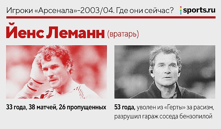 В 2003-м «Арсенал» готовился к смене эпохи: место легендарного Дэвида Симэна в воротах занял 34-летний голкипер дортмундской «Боруссии» Йенс Леманн. Удачный выбор: несмотря на ошибки и эксцентричное поведение, немец стал одним из героев сезона и получил «Золотую перчатку».