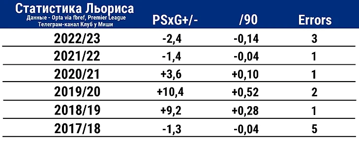 Errors – ошибки, приведшие к голу (не учитывают автоголы). PSxG – показатель продвинутой статистики, который показывает насколько хорошо вратарь справляется с ударами (учитываются удары в створ, качество удара и не учитываются пенальти). В первой колонке абсолютный показатель, то есть можно оценить от скольких мячей вратарь спас или сколько «лишних» мячей пропустил на дистанции сезона, но из-за разной дистанции сезона показательнее смотреть в пересчете на 90 минут (вторая колонка). Льорис каждый год ошибается, но обычно компенсирует это на дистанции.