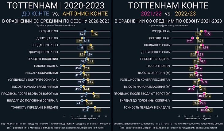 Если посмотреть на показатели последних трех лет, то с приходом Конте «Тоттенхэм» значительно прибавил. «Тоттенхэм» с начала 2020 года и до прихода Конте – крайне серая и средняя команда, что подтверждают статистические показатели, большинство из которых на уровне среднего по лиге. Собственно сезон 2020/21 команда закончила героическим врыванием в Лигу Конференций с помощью Гарета Бэйла, а на момент отставки Нуну «Тоттенхэм» шел девятым с катастрофическим перфомансом на уровне аутсайдера: разницей -7 и 16-м местом по xPTS (ожидаемые очки).