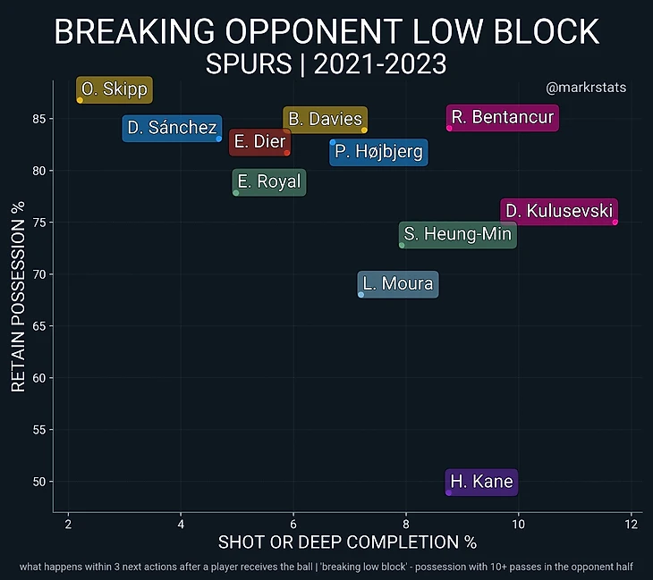 График показывает, что произойдет во время следующих трех действий после того, как игрок получил мяч. По оси X – вероятность того, что удар или проникновение в зону радиусом 20 метров от ворот (deep completion), по оси Y – вероятность того, что игрок сохранит владение. При подсчете учитываются владения, в которых было более 10 передач на чужой половине. В таких случаях действия Кейна и Бентанкура примерно на одном уровне ведут к обострению, но они на разных полюсах по уровню удержания владения. Вероятность того, что действия Кулусевски приведут к удару или deep completion – 11,7%, это лучший показатель в команде. При этом, вероятность того, что Деян сохранит владение выше, чем у других атакующих игроков.