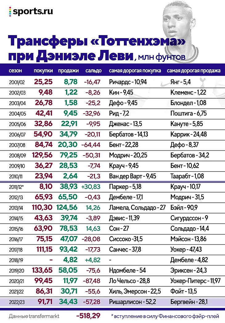 Это таблица из летнего текста про «Тоттенхэм». С тех пор ситуация изменилась не сильно и исключительно на бумаге. Клуб активировал опцию выкупа Кристиана Ромеро (примерно 45 млн фунтов), купил и отдал в обратную аренду Дестини Удоджи из «Удинезе» (15 млн фунтов). С приходом Фабио Паратичи такие сделки стали заключаться чаще. Например, до сих пор в аренде Деян Кулусевски без которого уже невозможно представить команду.