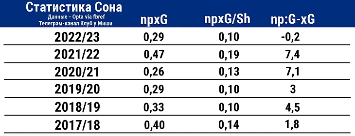 Реализация и форма Сона – актуальный вопрос, но не единственный, он намного шире. Прошлый сезон стал пиковым в том числе и потому что Сон наносил удары из наиболее выгодных позиций, у него самый высокий показатель xG/Sh за карьеру. В этом году произошел сильный откат, и это проблема всей команды, не только Сона. «Тоттенхэм» стал чаще отыгрываться, меньше возможностей убежать на пространстве, больше попыток взломать низкий блок.