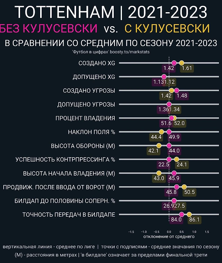 С ним команда создает больше остроты. Такие показатели как наклон поля (характеризует территориальное преимущество команды в матче, считается через соотношение действий команд в чужой трети) и высота обороны не зависят напрямую от использования Кулусевски, но через них можно косвенно судить о силе соперника. Обычно наклон поля и высота обороны ниже с более сильными соперниками. То есть с Деяном команда не просто больше создает, но и против более сильных соперников.
