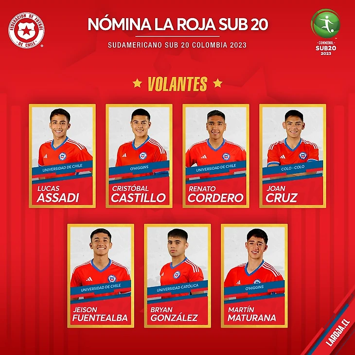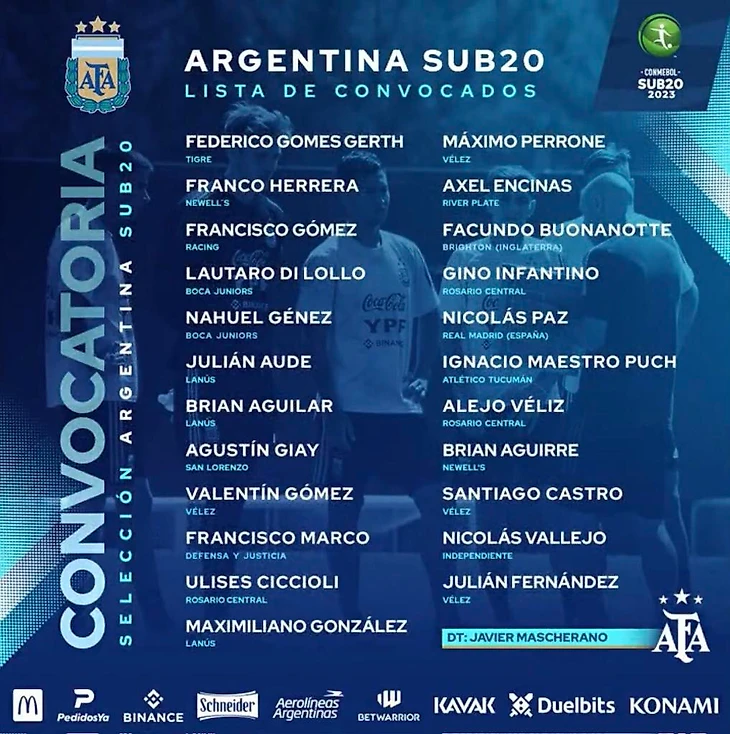 Николас Пас, игрок "Кастильи" и сын бывшего футболиста Пабло Паса.. Еще один яркий игрок — Факундо Буонанотте, бывший игрок "Росарио Сентраль", недавно приобретенный "Брайтоном". А также Агустин Джай, вингер из «Сан-Лоренсо», сыгравший более 20 матчей за первую команду, полузащитник Максимо Перроне из «Велеса», который перейдет в «Манчестер Сити», вратарь Федерико Гомес Герт из «Тигре» и нападающие Алехо Велиз из «Росарио Сентраль» и Николас Вальехо из "Индепендьенте"