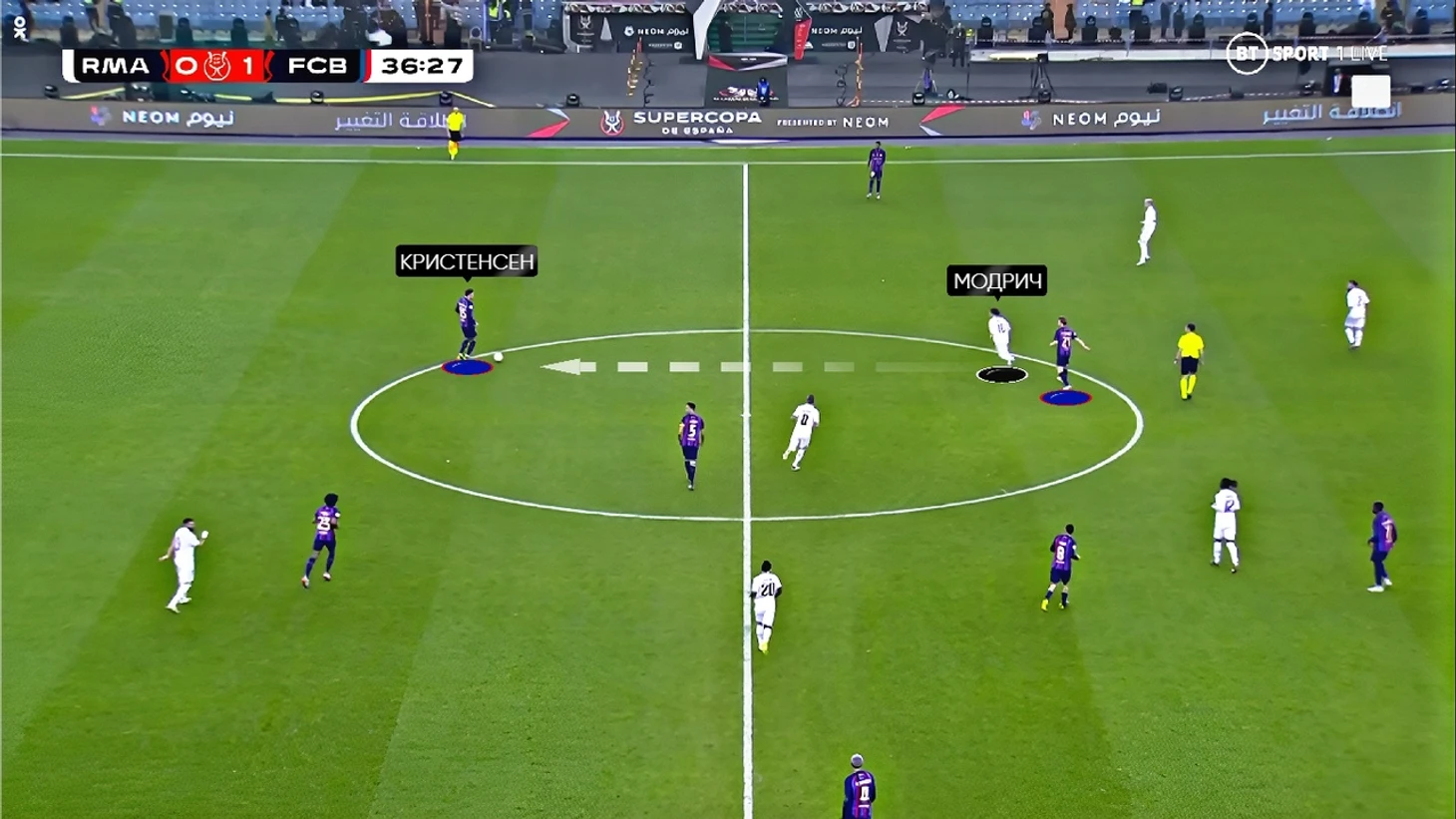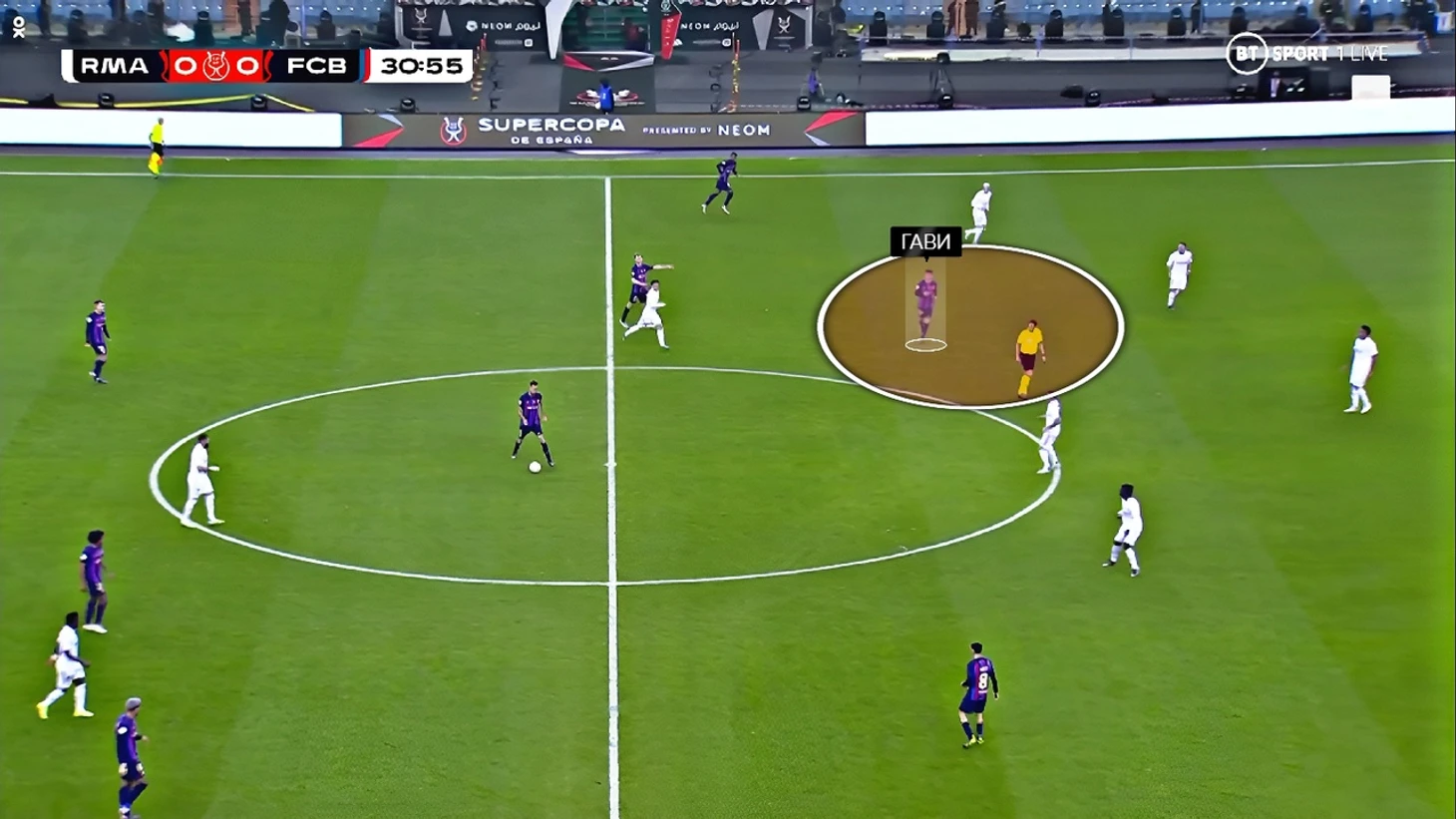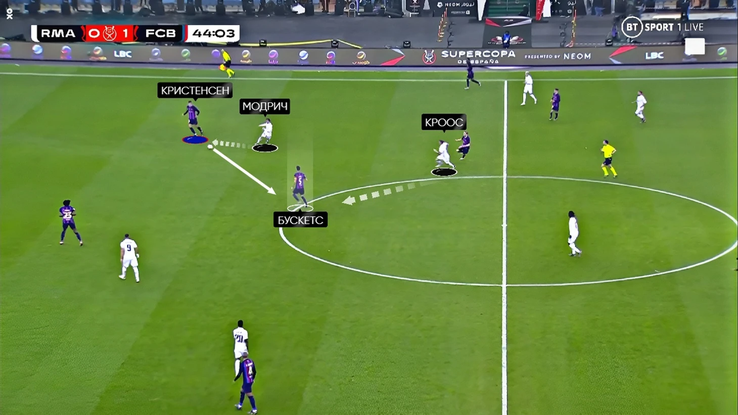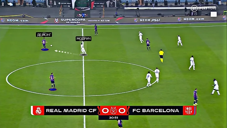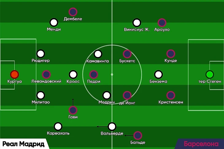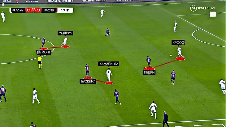 В первую очередь такое расположение связано с системой прессинга «Барсы» на этот матч. В центре поля «каталонцы» прессинговали по персональным ориентировкам – Педри с Кроосом, Бускетс с Камавингой, а де Йонг с Модричем: