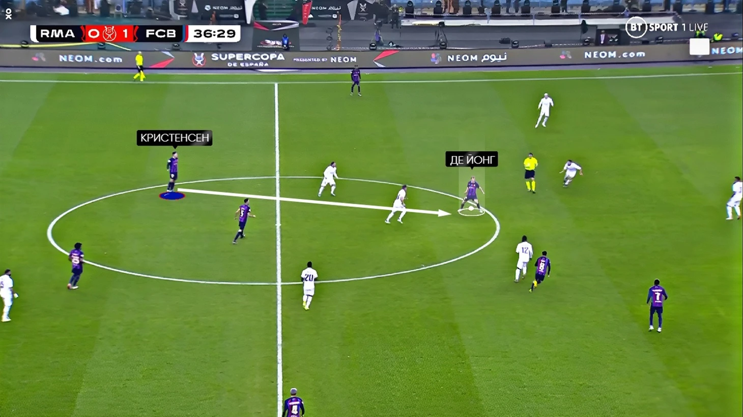 Ещё один случай, в этот раз свободным оказался Френки де Йонг. Лука Модрич оказывает давление на игрока с мячом (в этот раз Кристенсен), но датчанин делает пас на голландца, и тот получает мяч без прямого оппонента и прессинг «Реала» рассыпается: