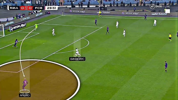 На самом деле, пару лазеек для выхода из-под давления «Барселоны» в первом тайме «Мадрид» показал. Одна из таких – опускания Бензема, за которым выдвигался Жюль Кунде. Потенциально за это можно было бы наказать «Барселону», но Винисиус плохо чувствовал такие моменты и не атаковал пространство за спиной (даже несмотря на подсказки партнёров):
