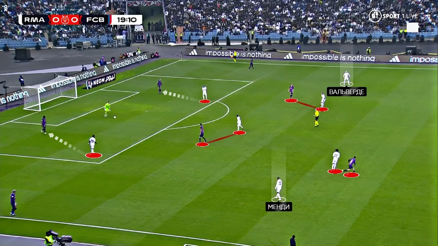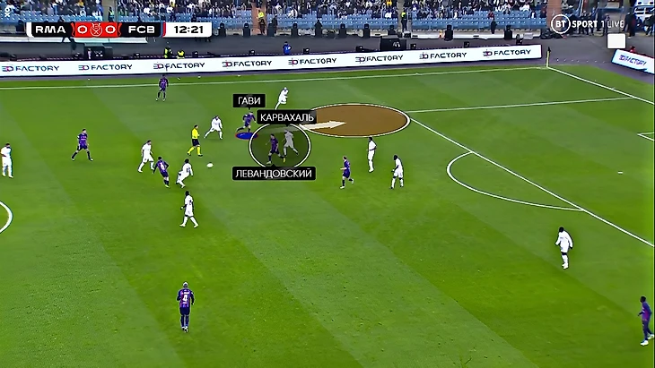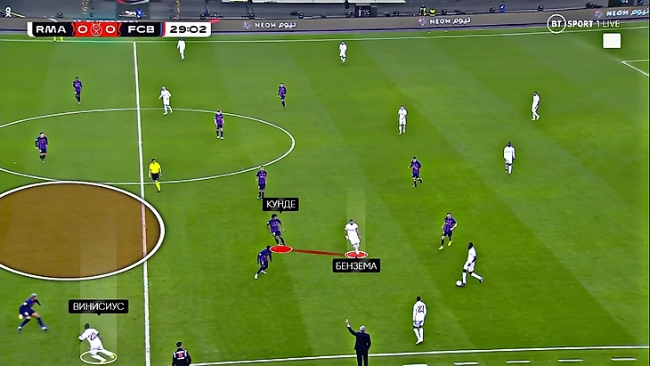 Прессинг «Реала» перекрывал варианты паса на Бускетса и де Йонга (Кроос и Модрич поднимались за ними), однако на флангах всё строилось не вокруг смелости, а смещений Винисиуса и Бензема (которые прессинговали на одной линии). Менди и Вальверде не поднимались до упора за фуллбеками «каталонцев», а оставались в более осторожной позиции: