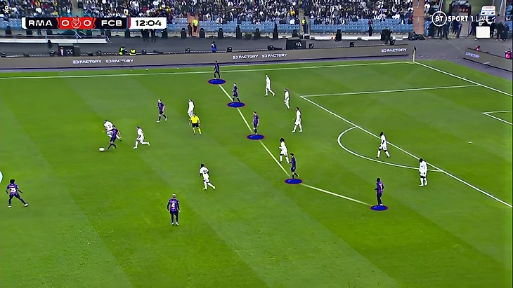 Структура «Барселоны» с одним осторожным крайним защитником (в данном случае Араухо) при владении становится похожа на 3-2-5. Как и в последнем Класико, Феде Вальверде садился в линию обороны, образуя пятёрку сзади (как раз чтобы иметь численное равенство в последней линии):