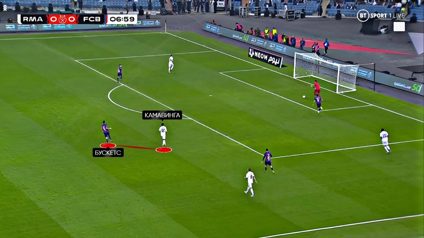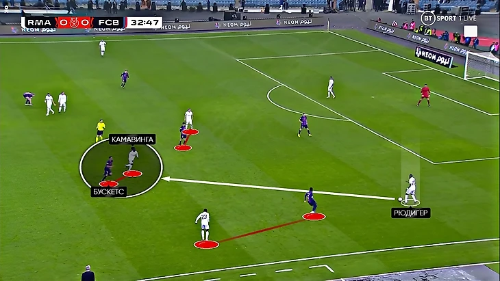 Великолепный прессинг и в частности смелая позиция Серджи Бускетса как раз позволили «Барсе» открыть счёт в матче: Тони Рюдигер получает мяч, но для него все варианты перекрыты и он пасует на Камавингу, на которого выдёргивается Бускетс и перехватывает мяч: