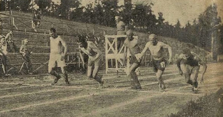 Август 1925 года. Спортплощадка ОППВ. Первенство Московского военного округа. Легкая атлетика. «Старт одного из бегов на 400 метров» (фото из двухнедельного иллюстрированного журнала «Известия физической культуры» № 16 за август 1925 года)