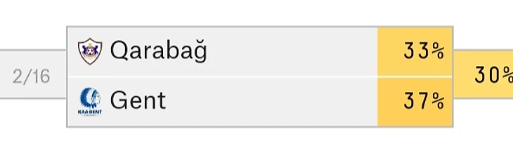 Первая игра Карабаха против Гента дома. Компьютер предсказал что Карабах 33% выиграет 37% проиграет и 30% сделает ничью.