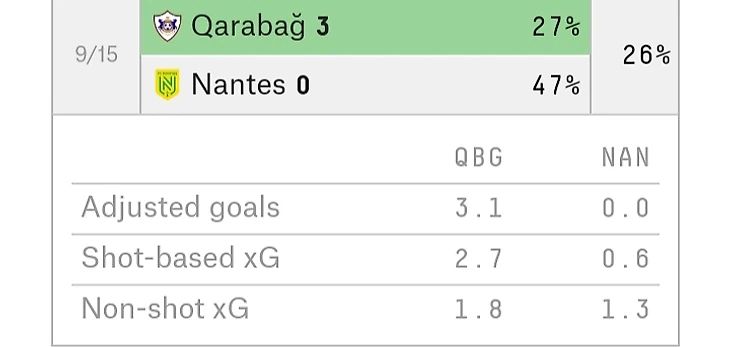 Карабах сыграл в Лиге Европы против Нанта где компьютер предсказал что 47% победит Нант, 26% ничья, а Карабах победит 27%. И итог Карабах победил Нанта 3:0.