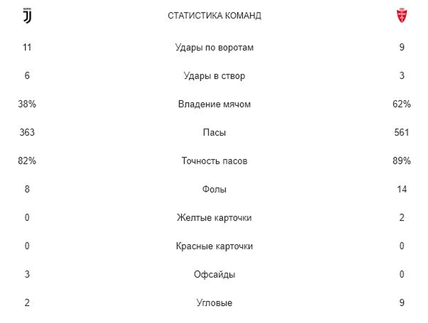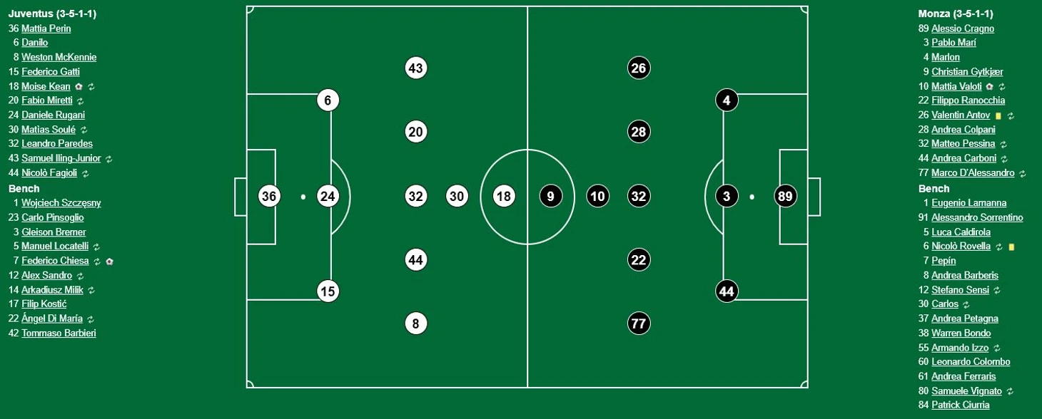 Команды фактически отзеркалили свои схемы - и Монца, и Юве выставили гибридную 3-5-1-1 с переходом после потери мяча в 5-3-2. Сразу отметим, что во втором тайме Ювентус почти не опускал фланги и старался наращивать давление - а для этого латерали оставались ближе к центру и ждали ошибок соперника.