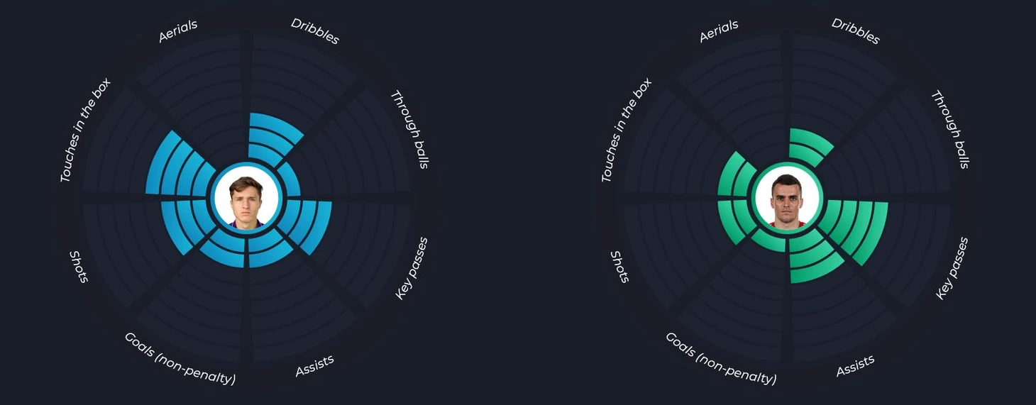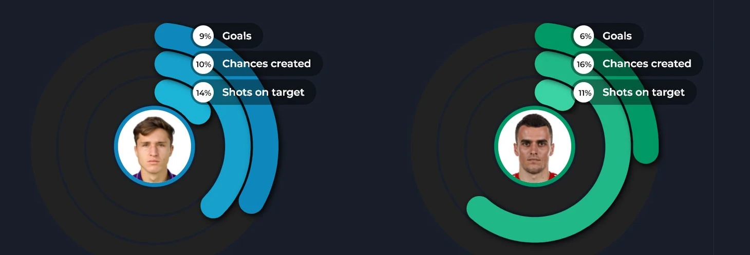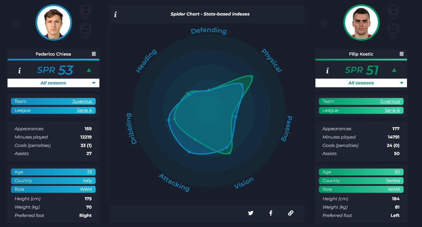 Федерико Кьеза гораздо больше нацелен на атаку и куда лучше чувствует себя при игре один в один. Лидируя в нашем сравнении в компоненте дриблинга, Феде может вести мяч и при низкой скорости, попросту обводя соперника. Костич, замедляясь, чаще теряет мяч или отдает его назад. Поэтому как правило Филип банально не идет в обводку и старается сразу обогнать соперника. Кьеза действует посмелее и может беспрепятственно обойти 3-4 игроков и зайти в штрафную с мячом для удара. Отсюда и куда более высокая результативность.