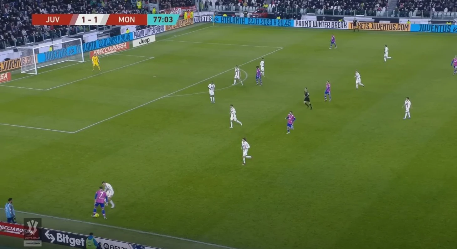 Таким был Ювентус в августе и сентябре. И именно так Ювентус провел первый тайм с Монцей, забив ранний гол на 8 минуте и пропустив ответный гол с углового. Фактически, до свистка на перерыв больше опасных моментов у обеих команд не было. Во втором тайме Юве значительно прибавил в давлении в связи с выходом на поле Кьезы, Локателли и Ди Марии. Именно Федерико и организовал гол, причем сделал это самостоятельно. Разберем этот гол, ставший ключевым фактором победы и был создан вопреки системы главного тренера Аллегри.