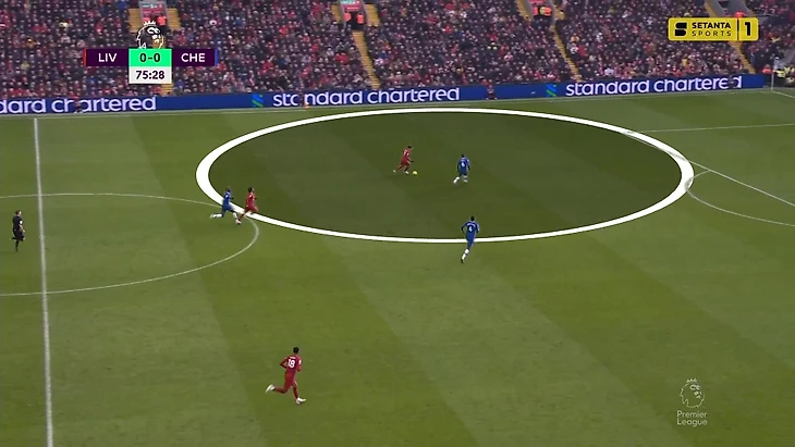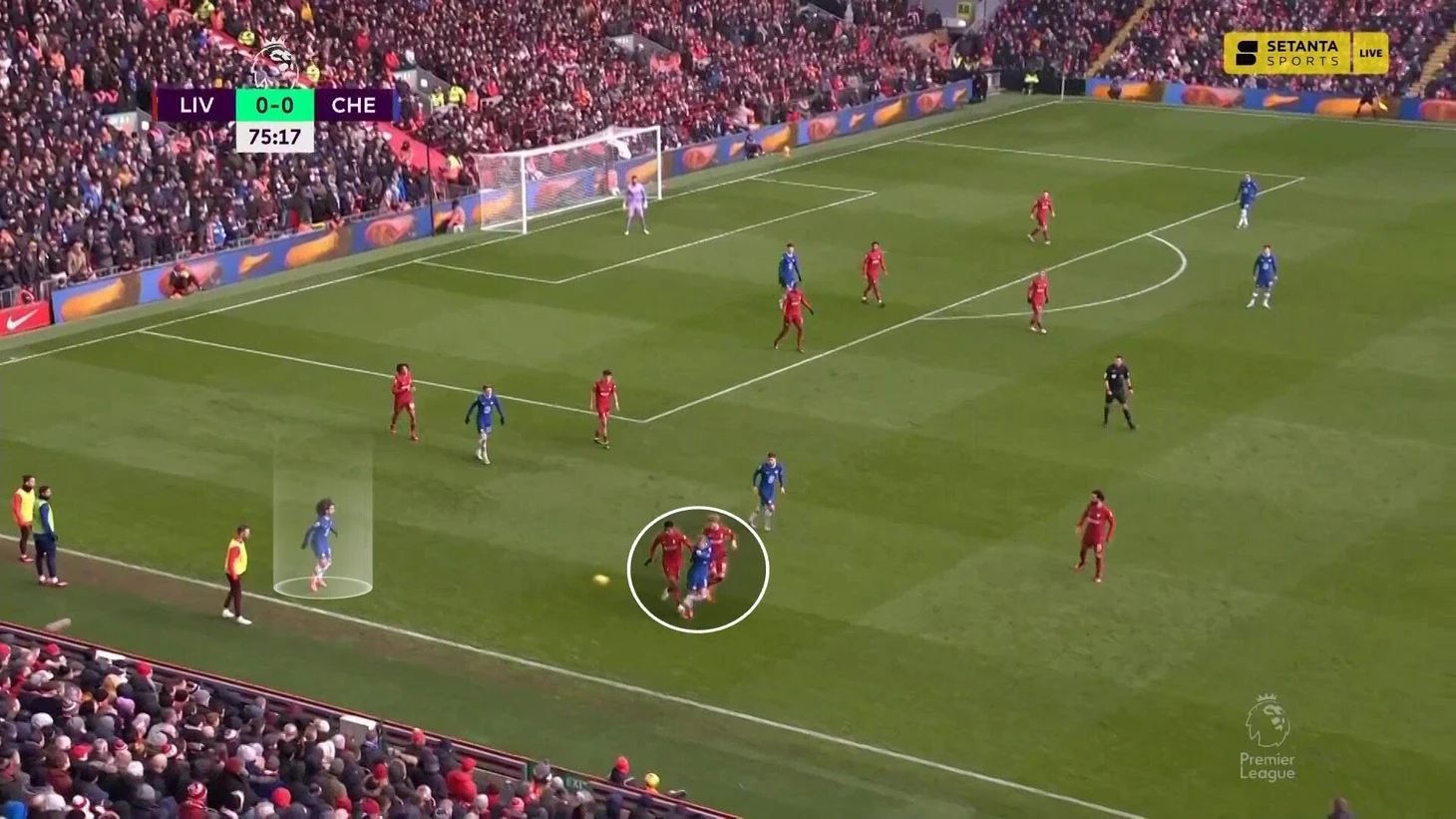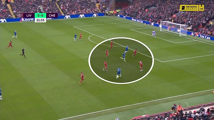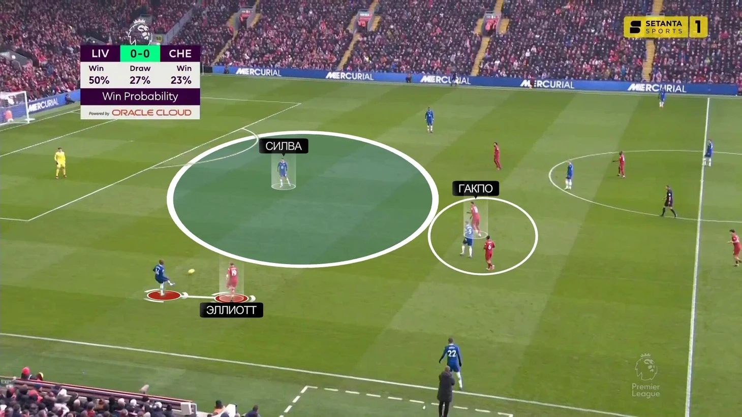 Когда прессинг все-таки начинался, он допускал ошибки, связанные с нехваткой понимания и плохим таймингом (то есть не халтурил, а именно не до конца понимал, что делать). Например, тут Харви Эллиотт давит на Чалобу, а Гакпо уже должен быть в пути к Тиаго Силве, но вместо этого стоит около Жоржиньо (хотя там уже есть Алькантара):