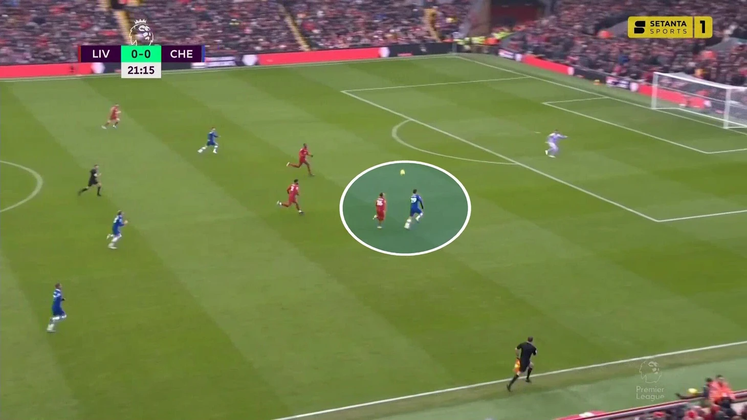Здесь Тиаго один против Нуньеса на гектаре пространства. Бразилец грамотно плассировал, закрыл сопернику дорогу в центр, при этом не вступал в отбор и в итоге вынудил бить с левой ноги – момент оказался намного менее опасным, чем мог бы быть: