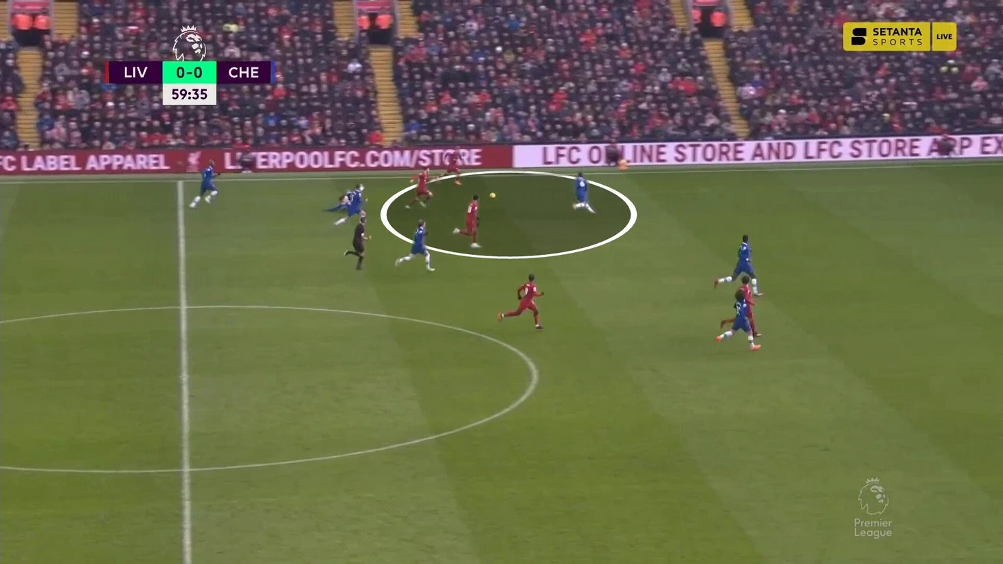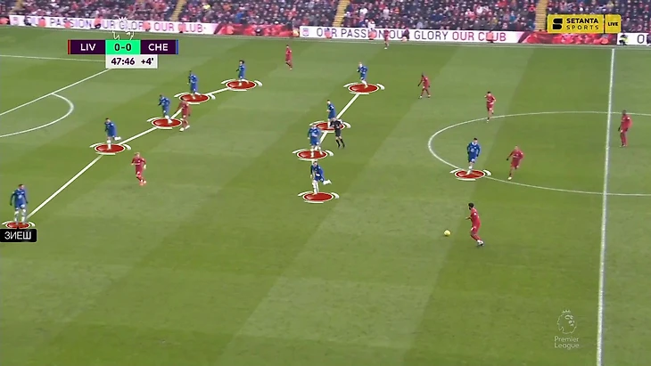 Еще одна проблема – банальная нехватка сыгранности. В прессинге она проявлялась через действия Гакпо и чаще бросалась в глаза. Но ужасные эпизоды были и на своей половине поля. Например, тут у «Ливерпуля» явное численное преимущество, но игроки расставились так, будто хотят открыть Зиешу наиболее удобный коридор для паса: