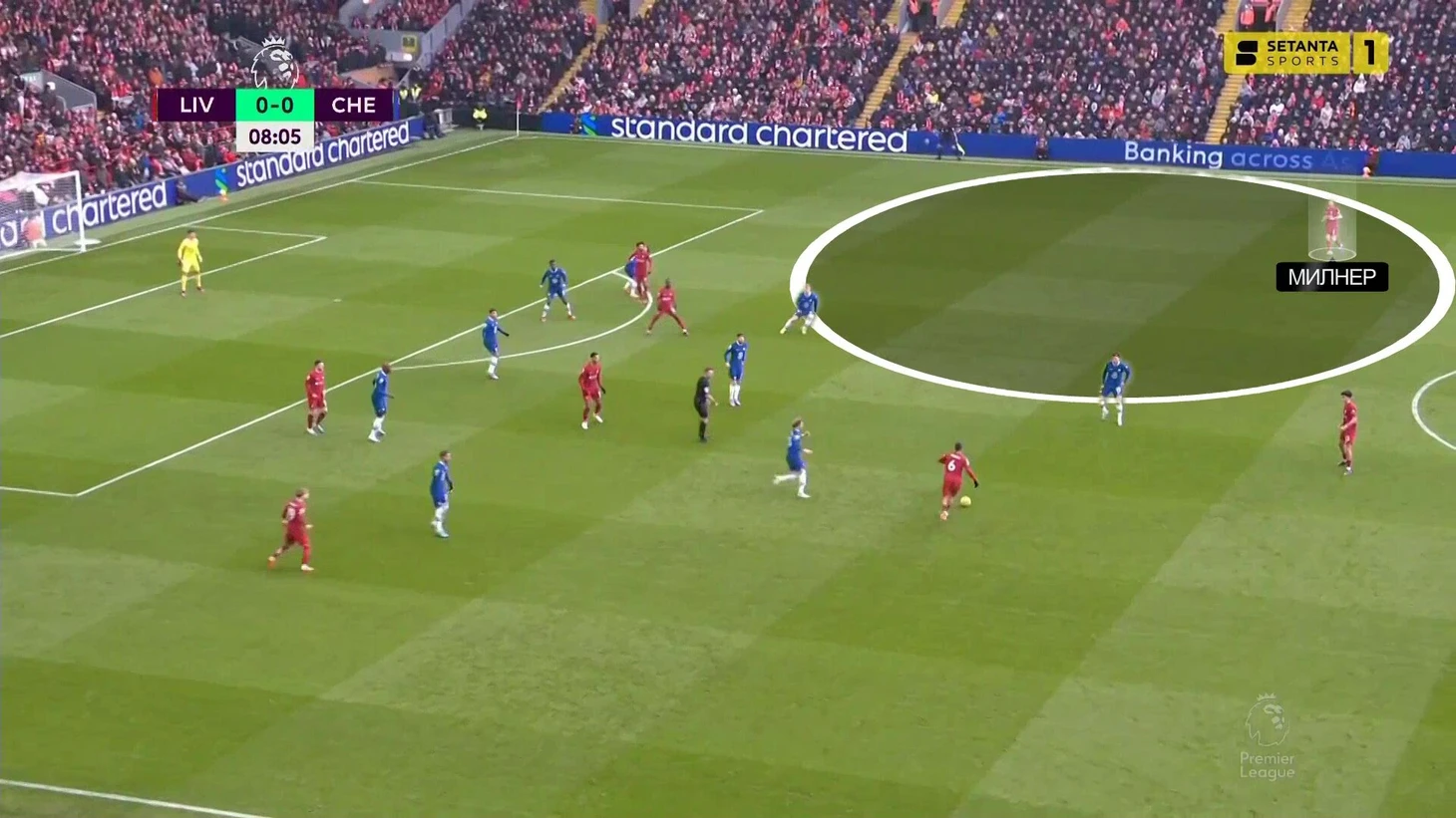 Вторая вопиющая проблема «Ливерпуля» – использование правого фланга в атаке. «Челси» совсем не боялся Милнера, оставляя ему пространство. Джеймс не мог наказать эффективным созиданием (как Трент) и часто располагался слишком низко: