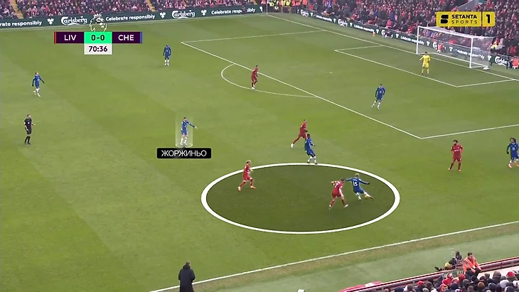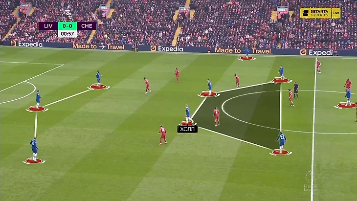 Интересной особенностью было использование при розыгрышах в опорной зоне Льюиса Холла рядом с Жоржиньо. Холл – 18-летний левый защитник с багажом из четырех матчей в АПЛ. Видеть его в таком образе необычно, но эффективным ход не назвать. В центральной зоне Льюис попадал под совсем другой объем давления при получении мяча, часто принимал не лучшие решения и даже терял мяч в опасных зонах: