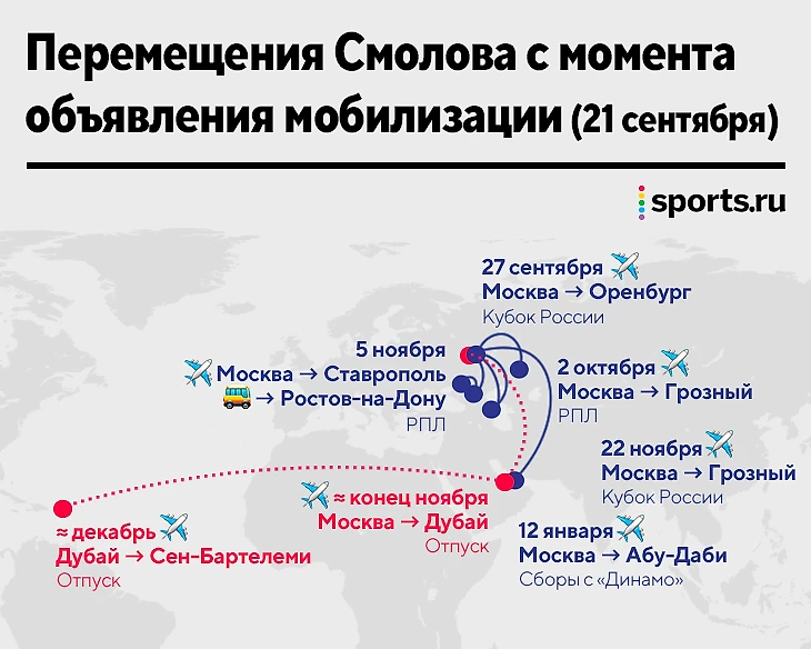 Это правда: Смолов постоянно перемещается, а в Эмиратах вообще побывал за это время дважды. Только вот не очень похоже на желание скрыться от мобилизации.