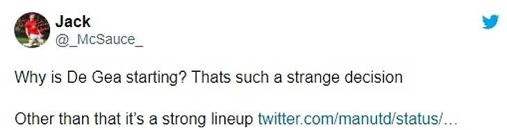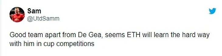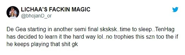 «Де Хеа в старте в очередном полуфинале…отстой…пора спать. Тен Хаг решил учиться на горьком опыте ха-ха…снова останемся без трофеев в этом сезоне, если он продолжит играть с этим дерьмовым голкипером».