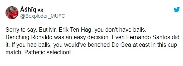 «Жаль это говорит, но мистер Те Хаг, у вас нет яиц. Посадить Роналду на скамейку было легко. Даже Фернанду Сантуш это сделал. Если бы у вас были яйца, то вы бы посадили и Де Хеа хотя бы на кубковые матчи. Жалкий состав!».