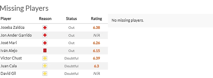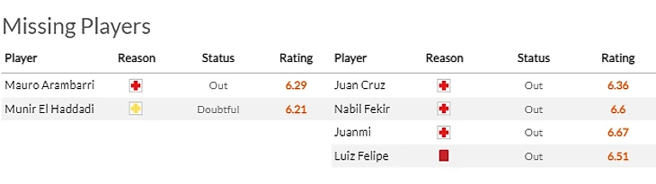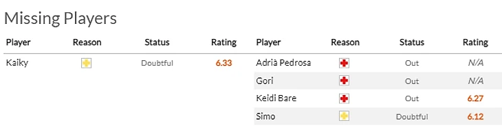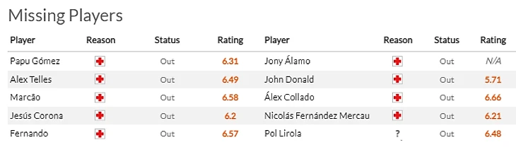 Что касается более близких перспектив, то ближайший тур андалусийцам придется провести без травмированного Ламелы(7,5) и вероятнее всего без Марко Дмитровича(5,5), который не смог закончить кубковый матч из-за повреждения. А гостям в игре с альмаматер не поможет перебравший карточек Кармона(5).
