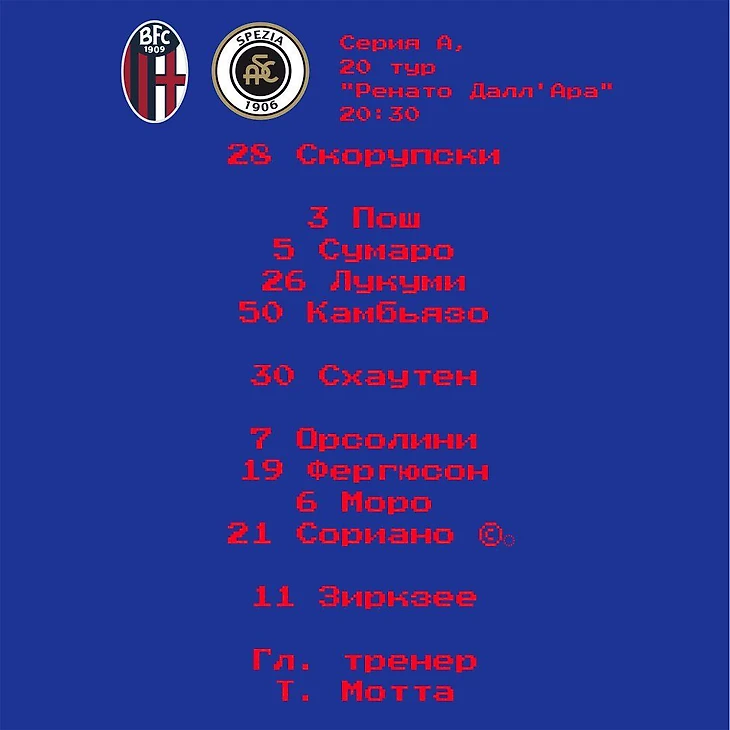 В старте - ряд сюрпризов от Тиагу Мотты. Начать стоит с выхода Камбьязо, который не уступает в скорости яркому правому латералю "Специи" Хольму и, видимо, поэтому впервые за долгое время заслужил место в основе. Обращает на себя внимание и отсутствие Домингеса с первых минут: аргентинец невзрачно возобновил чемпионат и много ошибался в последних играх.