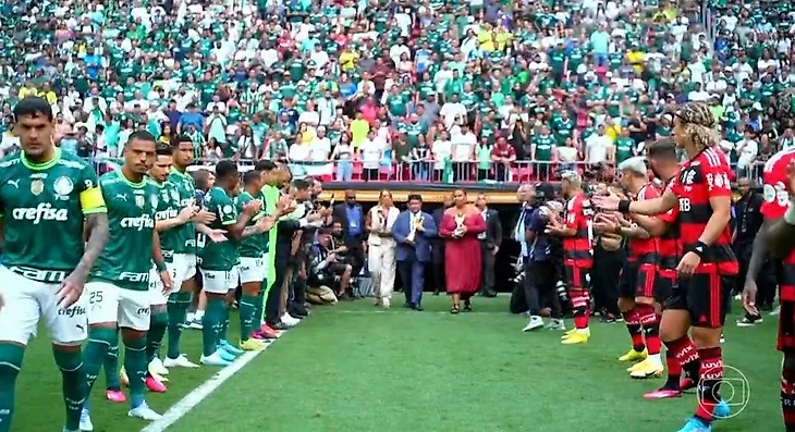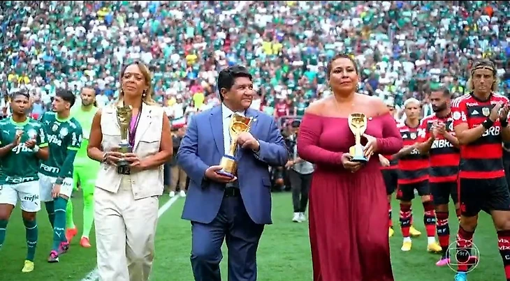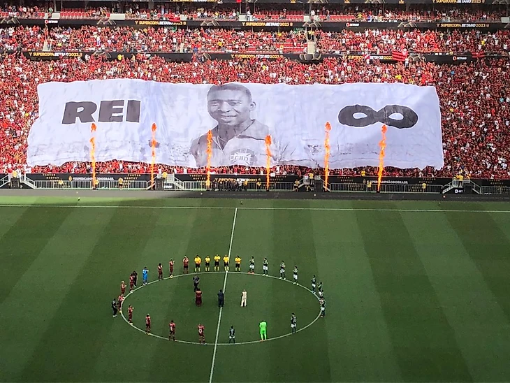 Матч начался с красивой дани памяти Пеле. Под «чемпионский» коридор из игроков президент КБФ Эдналдо Родригес и две дочери Короля вынесли кубки мира,к завоеванию которых приложил все усилия их отец. Поставив Нике на постаменты,они еле сдерживали слезы,когда центральная трибуна растянула гигантское полотнище.