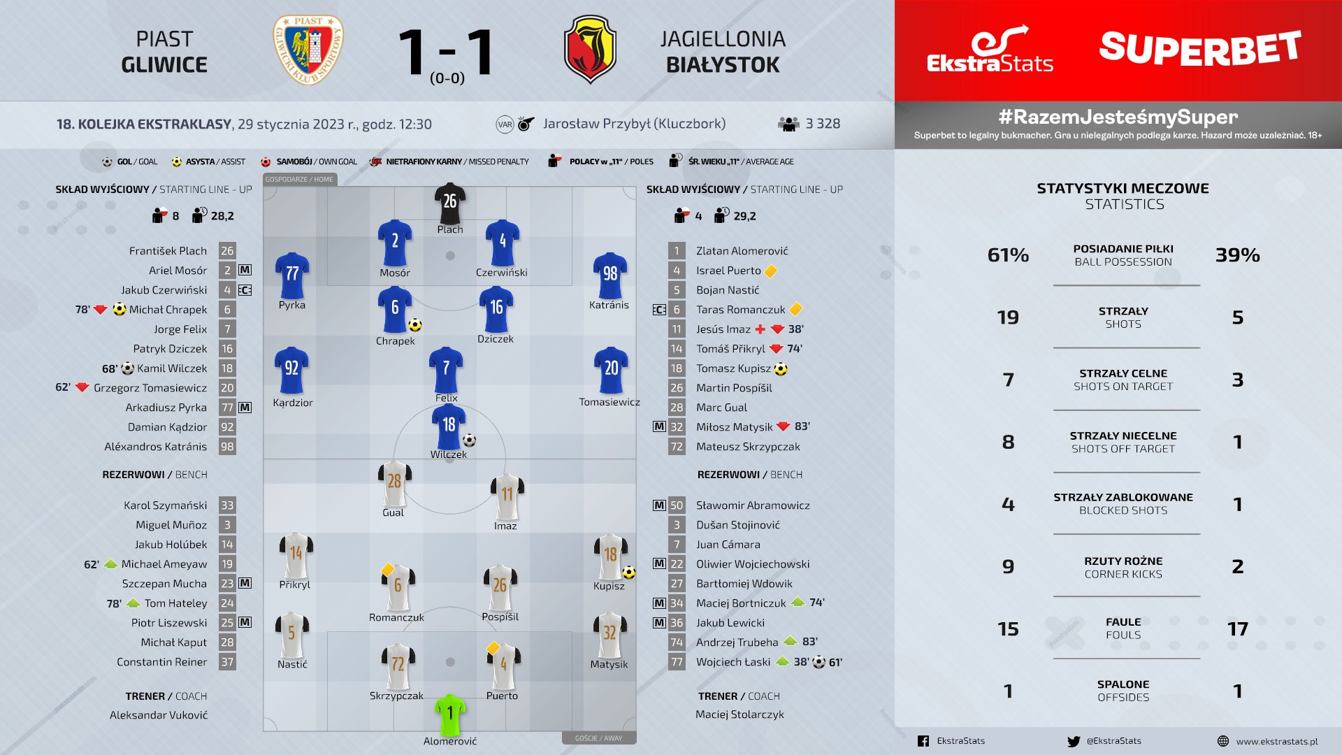 В воскресенье встречались «Пяст» и «Ягеллония», которым всерьез угрожает вылет из Экстракласы. Ранний воскресный матч не изобиловал опасными моментами в первые 45 минут. Гости сделали ставку на дальние передачи в направлении Гуала, дважды пробившего по воротам Плаха до перерыва. С качеством передач у белосточчан были серьезные проблемы. Общий процент точности передач по окончании матча составил около 56%. Проблем гостям доставила травма Хесуса Имаза, покинувшего поле еще до перерыва. Вместо испанца вышел 22-летний Войцех Ласки.